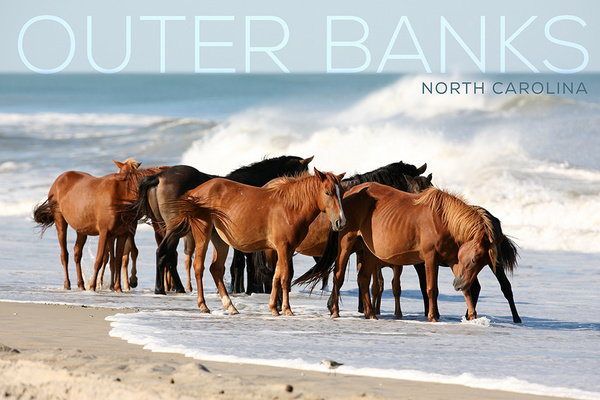 Outer Banks, North Carolina - Horses on Beach - Lantern Press Photography