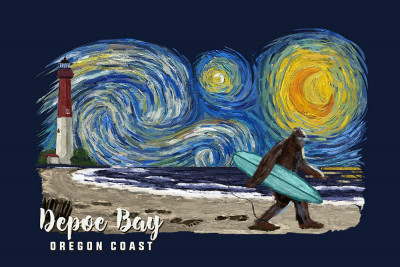 Depoe Bay, Oregon - Starry Night - Bigfoot on the Beach - Contour - Lantern Press Artwork