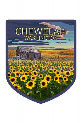 Chewelah, Washington - Painterly - Wheat Fields - Shack & Sunflowers - Contour