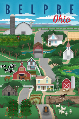 Belpre, Ohio - Retro Countryside - Blue & Red Text