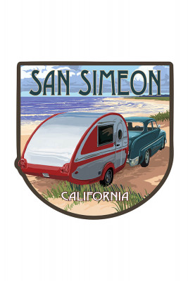 San Simeon, California - Painterly - Retro Camper on Beach - Contour