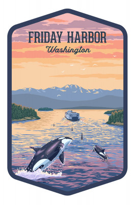 Friday Harbor, Washington - Painterly - Orca & Ferry Sunset Scene - Contour