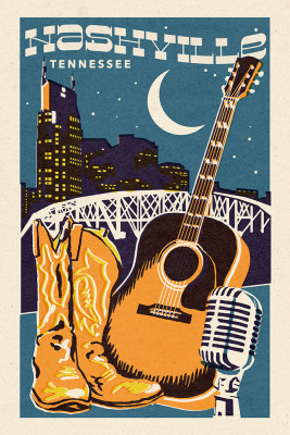 Nashville, Tennessee - Woodblock City Series - Skyline & Guitar
