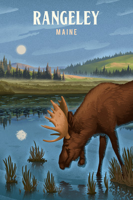 Rangeley, Maine - Lithograph - Reflection Pond & Bull Moose