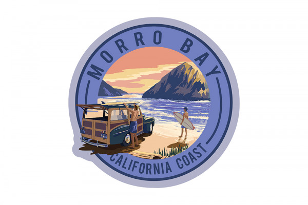 Morro Bay, California - Woody and Surfers on the Beach - Contour